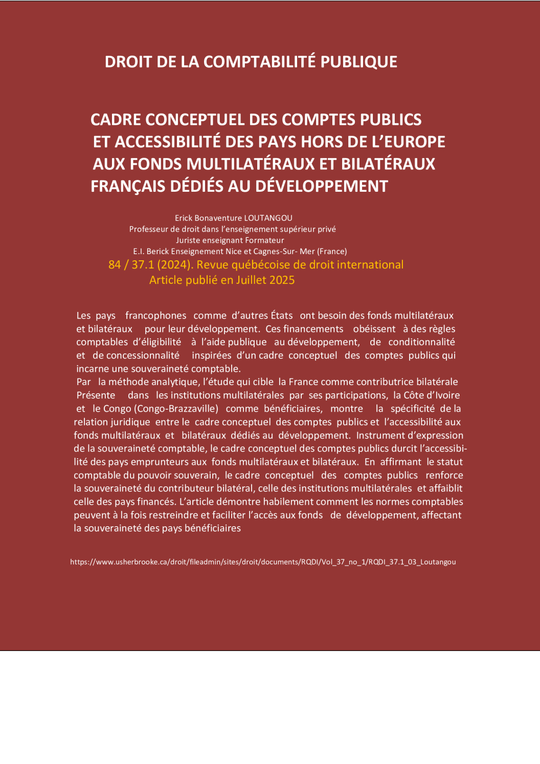 Cadre conceptuel des comptes publics et accessibilité des pays hors de l'Europe aux fonds multlilatéraux et bilatéraux francais dédiées au développement. La méthode analytique mobilisée permet une compréhension nuancée des interactions entre le cadre conceptuel des comptes publics et l'accessibilité aux financements illustée par de études de cas spécifiques (La France, la Côte d'Ivoire et la République du Congo "Congo-Brazzavile")